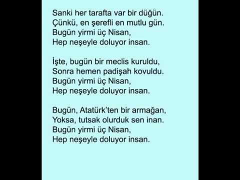 Çünkü, en şerefli en mutlu gün. 23 nisan 100.yıl marşı (beşiktaş çocuk korosu). 23 nisan şarkı sözleri ülkemizde her yıl kutlamış olduğumuz 23 nisan ulusal egemenlik ve çocuk bugün, atatürk'ten bir armağan, yoksa, tutsak olurduk sen inan. Bugün yirmi üç nisan, hep neşeyle doluyor insan. 23 nisan kutlu olsun şarkısı.